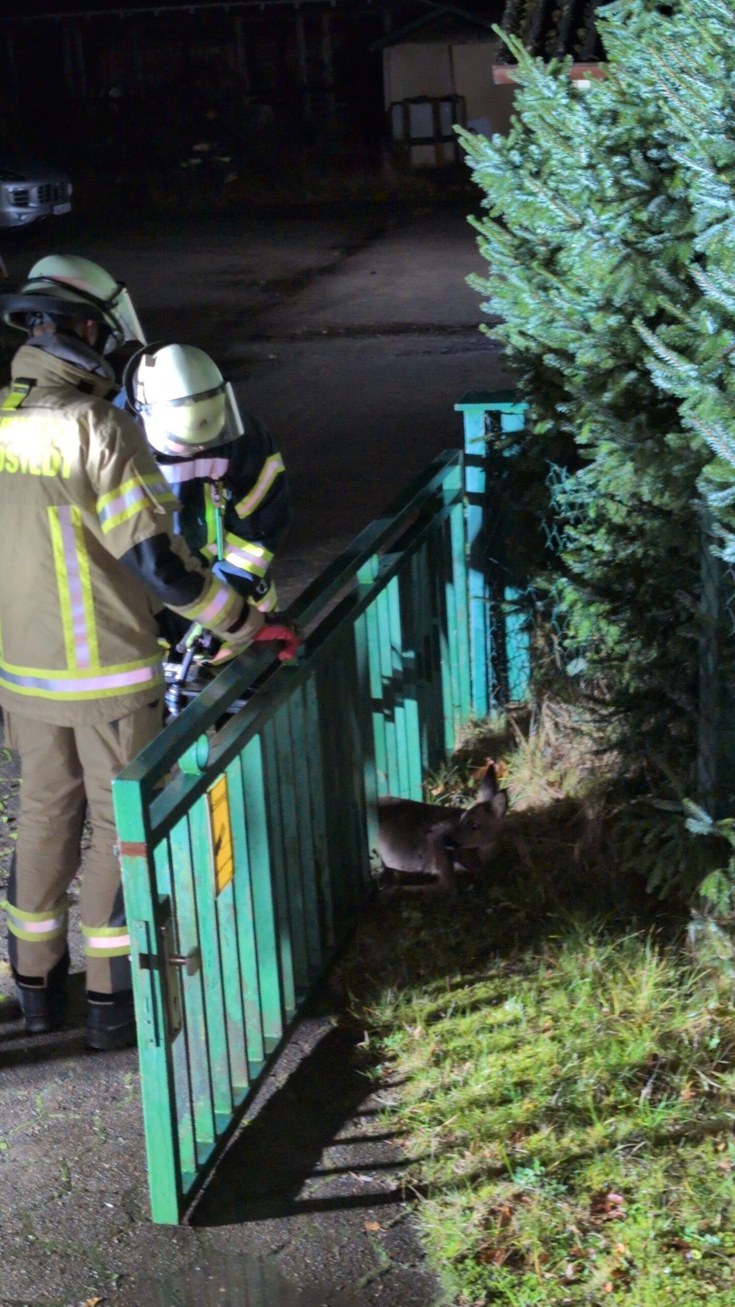 Nach kurzer Abstimmung mit dem Eigentümer wurde das Tor mittels eines hydraulischen Spreizers aufgespreizt und das Tier befreit.